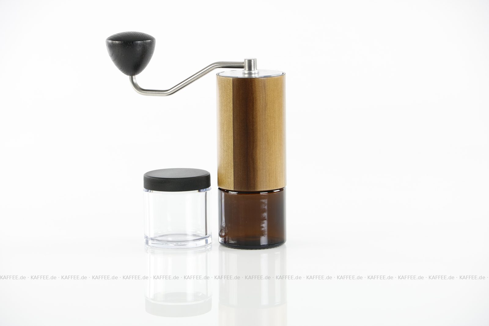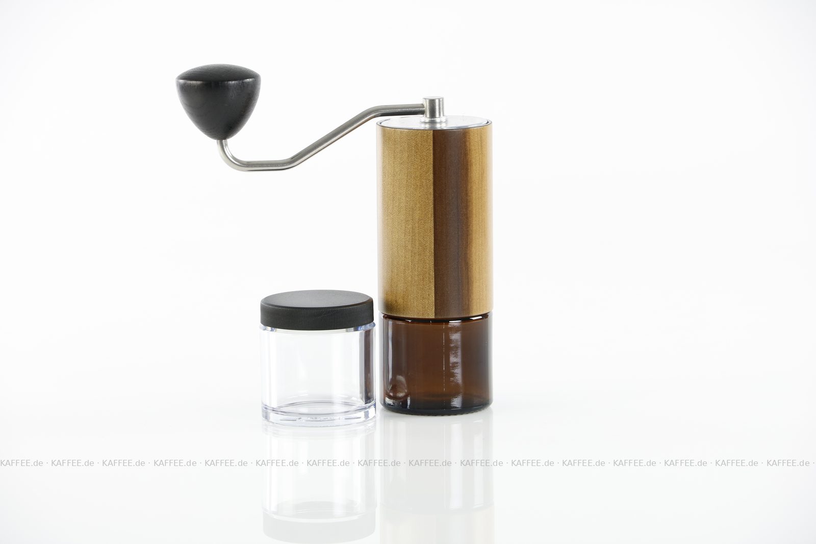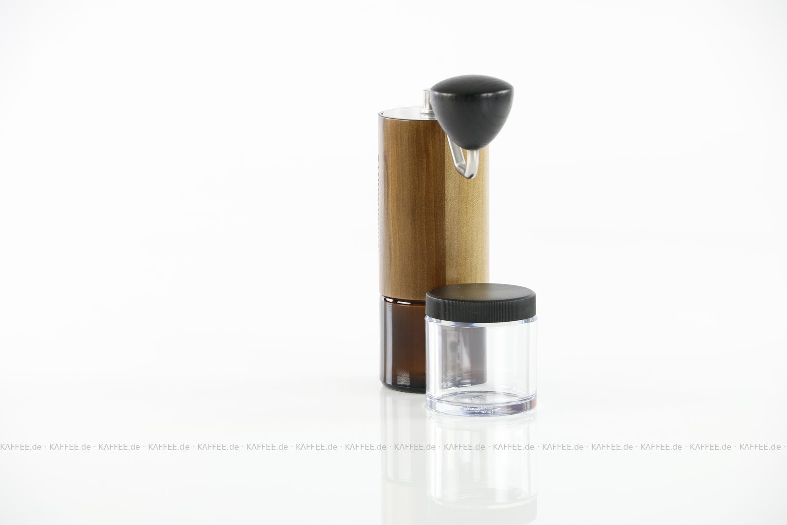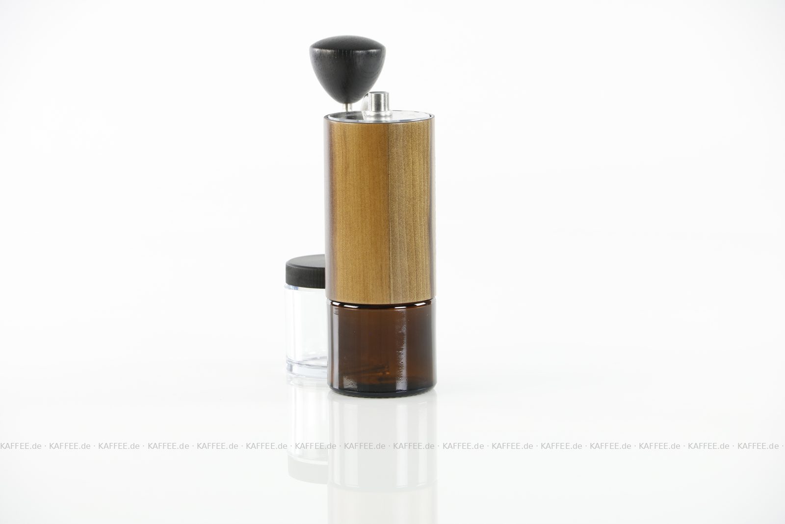 Material "Liquid Amber", sehr hochwertige Handmühle aus deutscher Produktion inkl. zwei Auffangbehälter Braunglas bzw. transparentem Polymer-Glas (Tritan), EAN-Code: 4260113437483