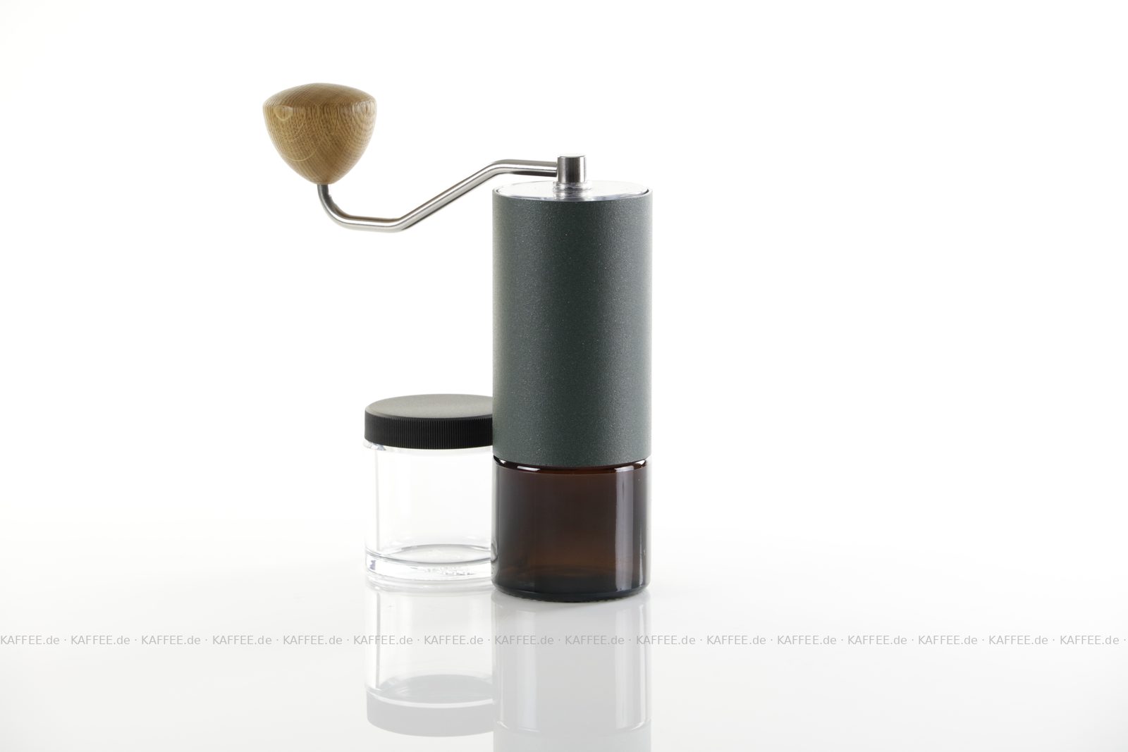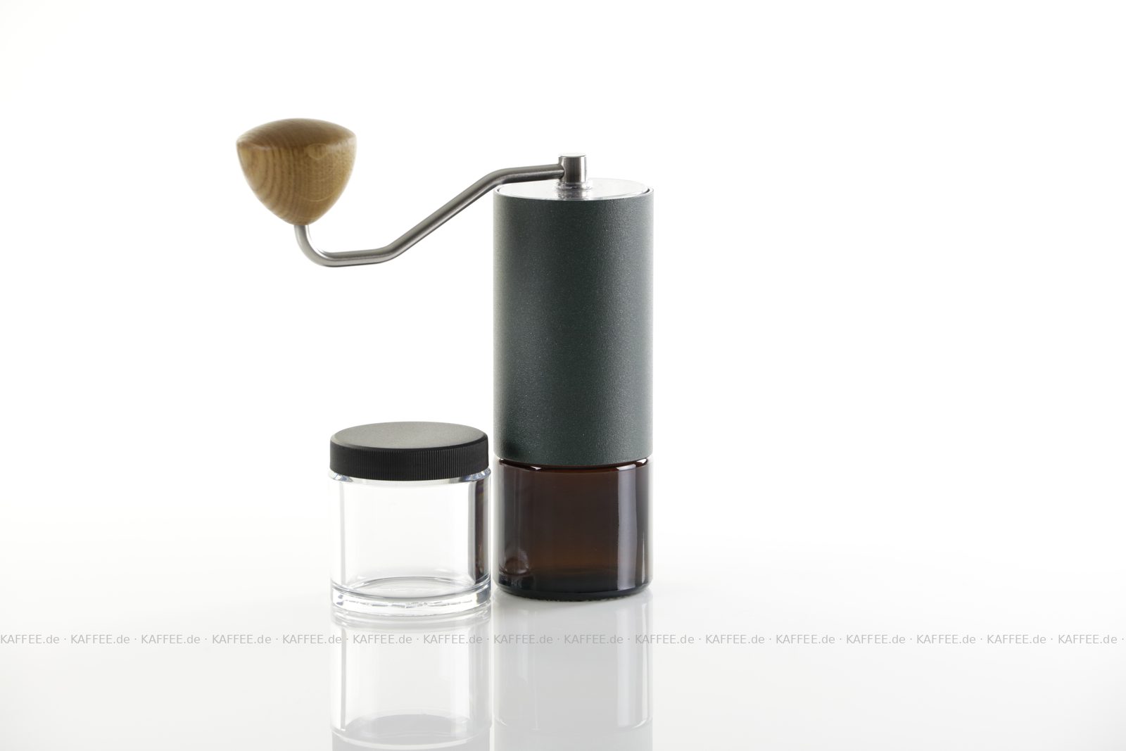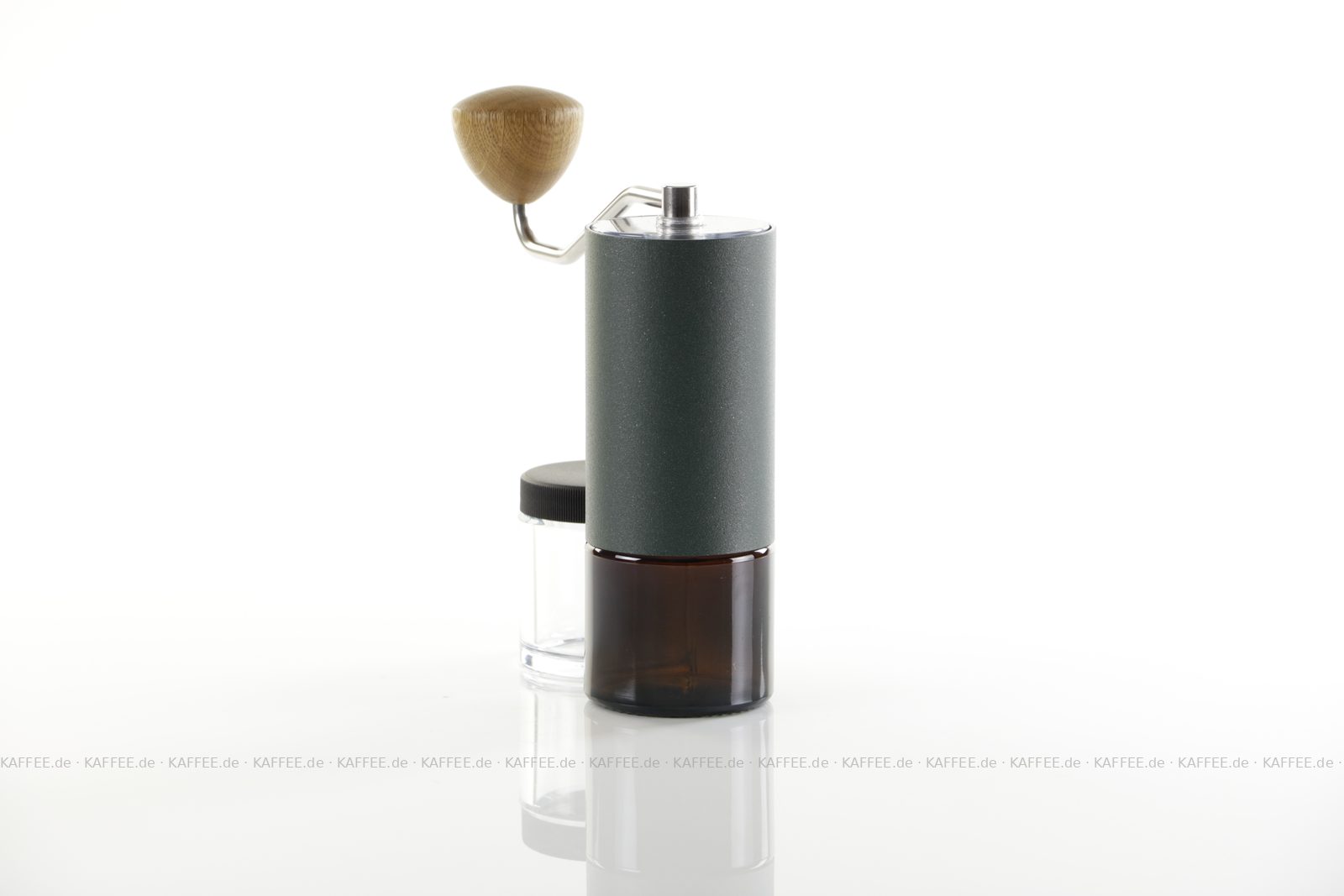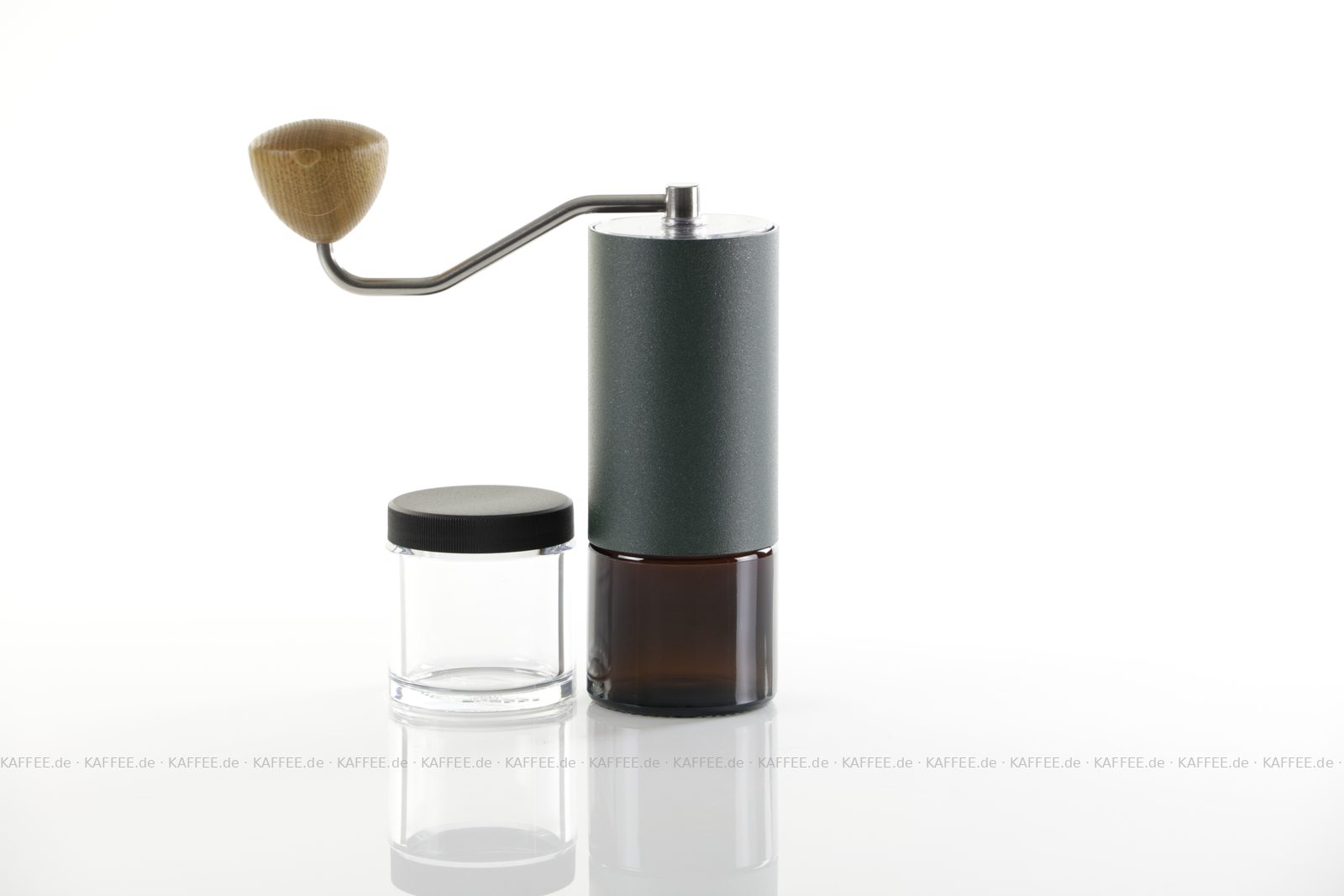 Design "Racing Green", sehr hochwertige Handmühle aus deutscher Produktion inkl. zwei Auffangbehälter Braunglas bzw. transparentem Polymer-Glas (Tritan), EAN-Code: 4260113438107