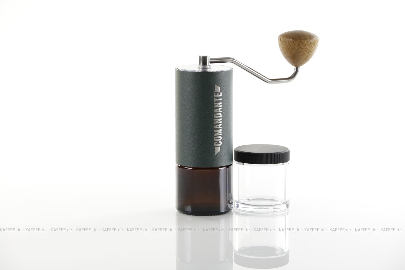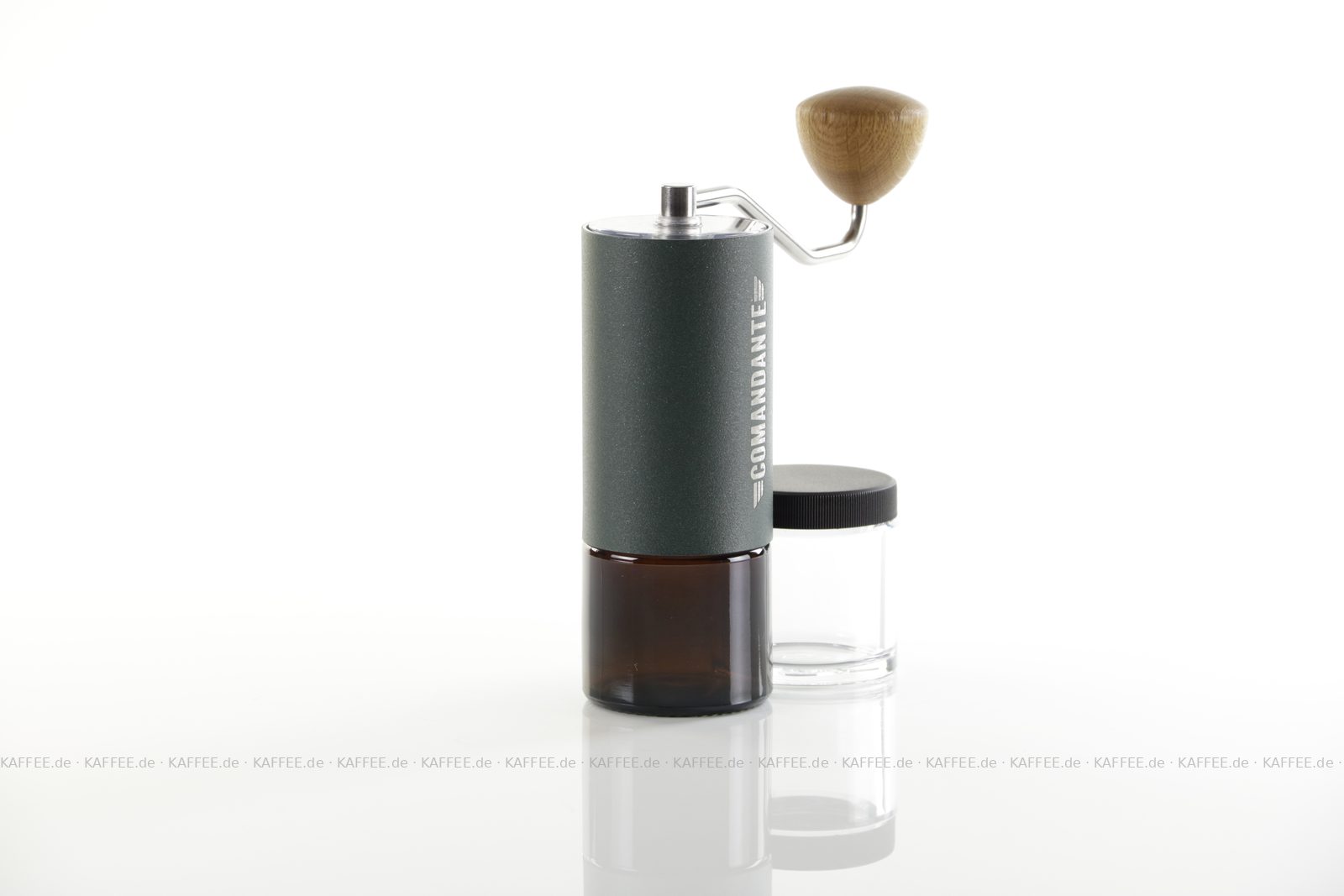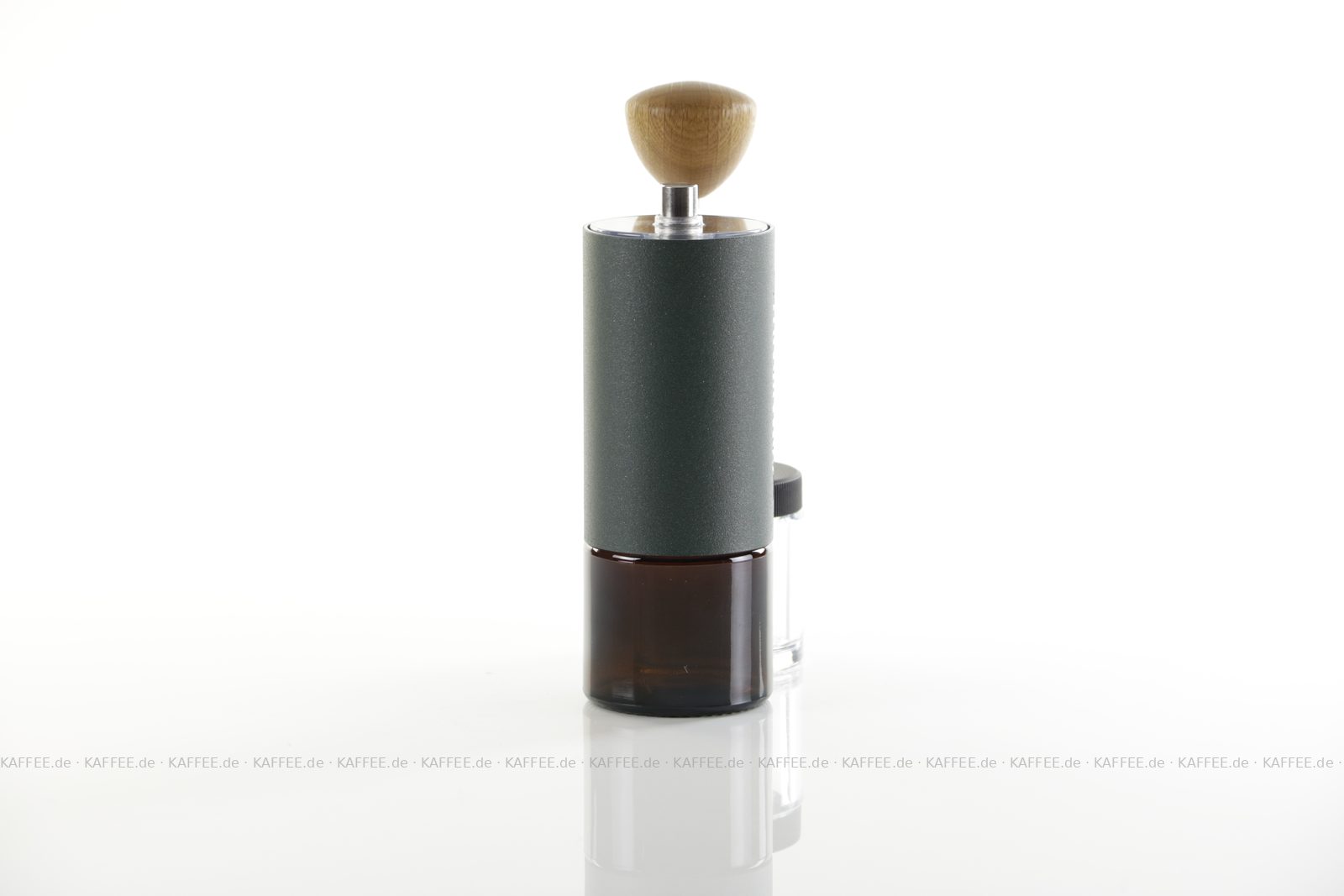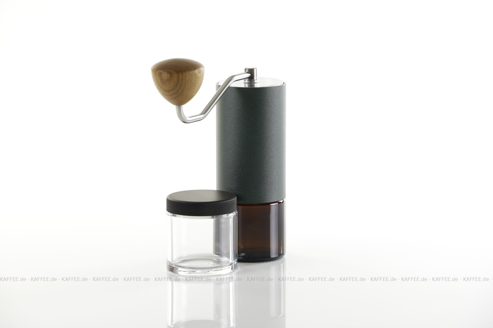 Design "Racing Green", sehr hochwertige Handmühle aus deutscher Produktion inkl. zwei Auffangbehälter Braunglas bzw. transparentem Polymer-Glas (Tritan), EAN-Code: 4260113438107