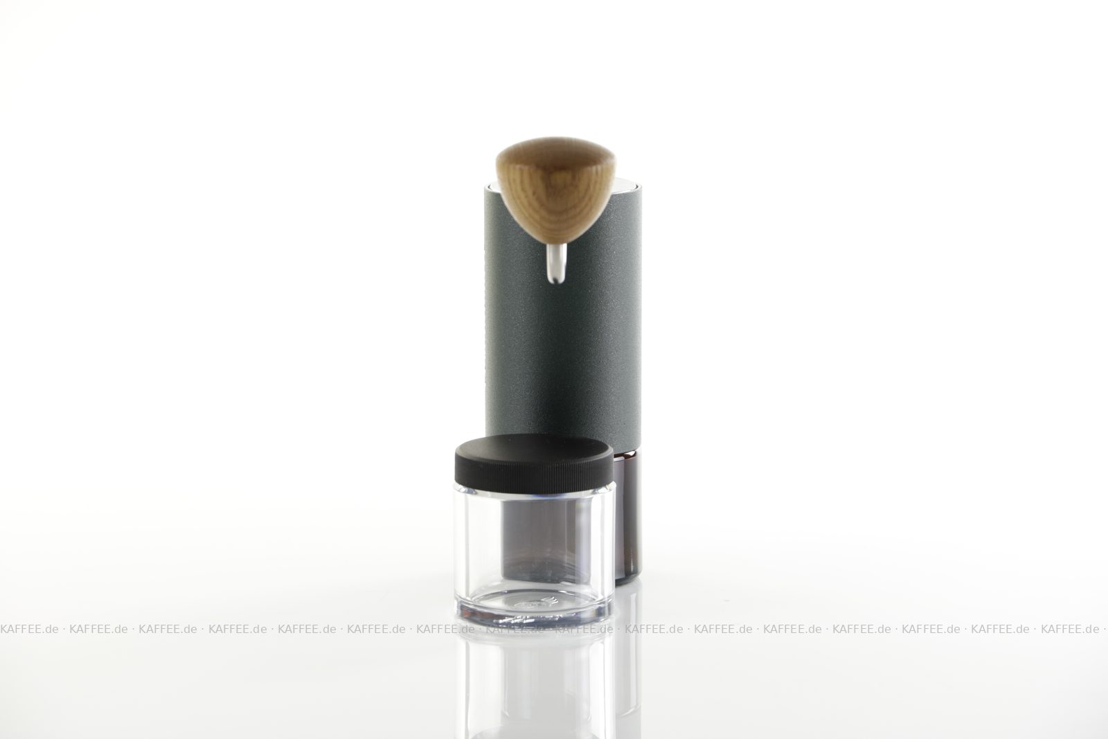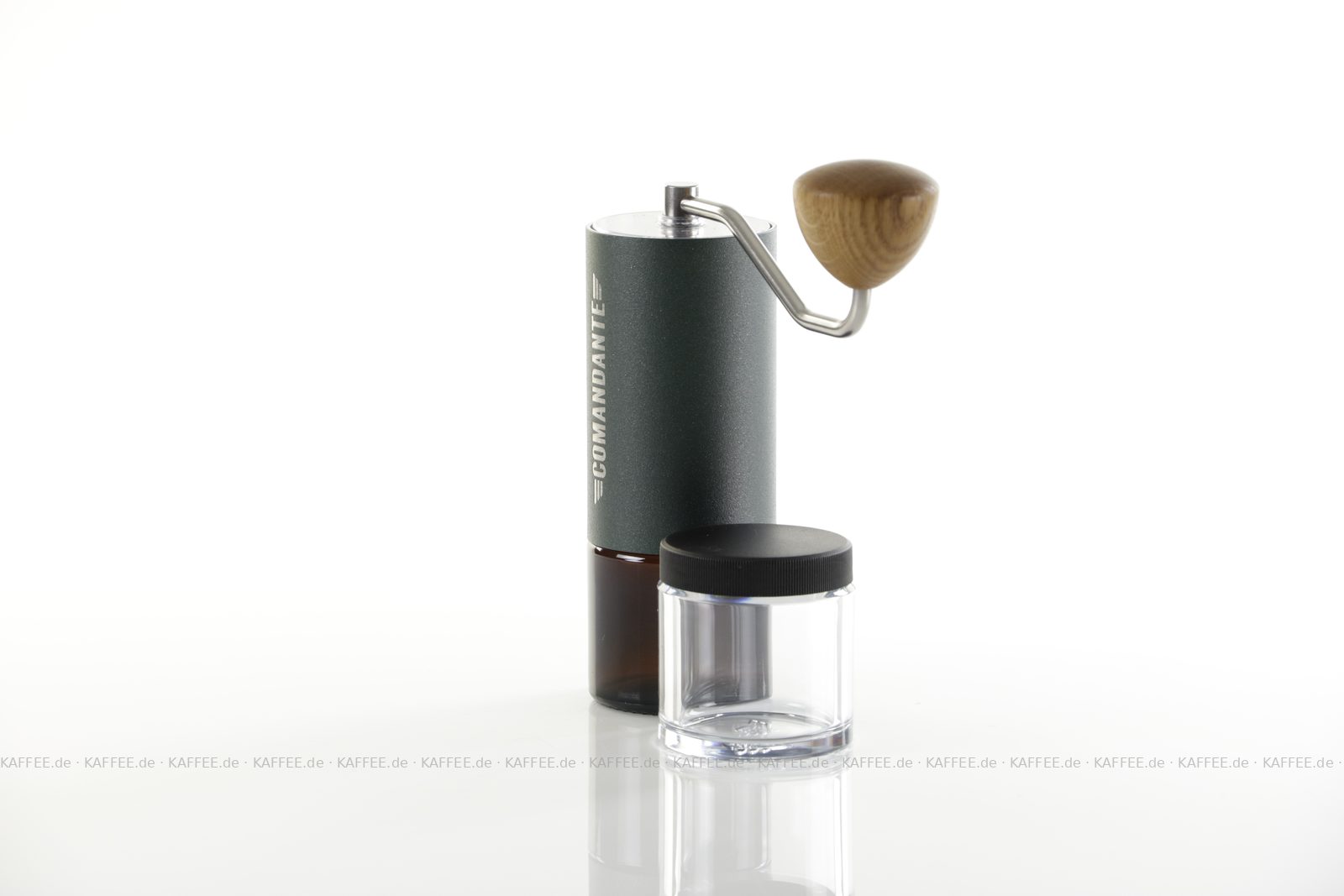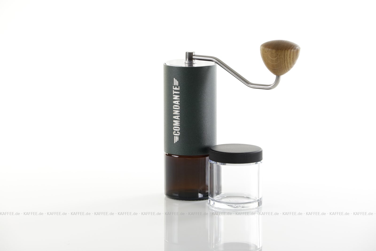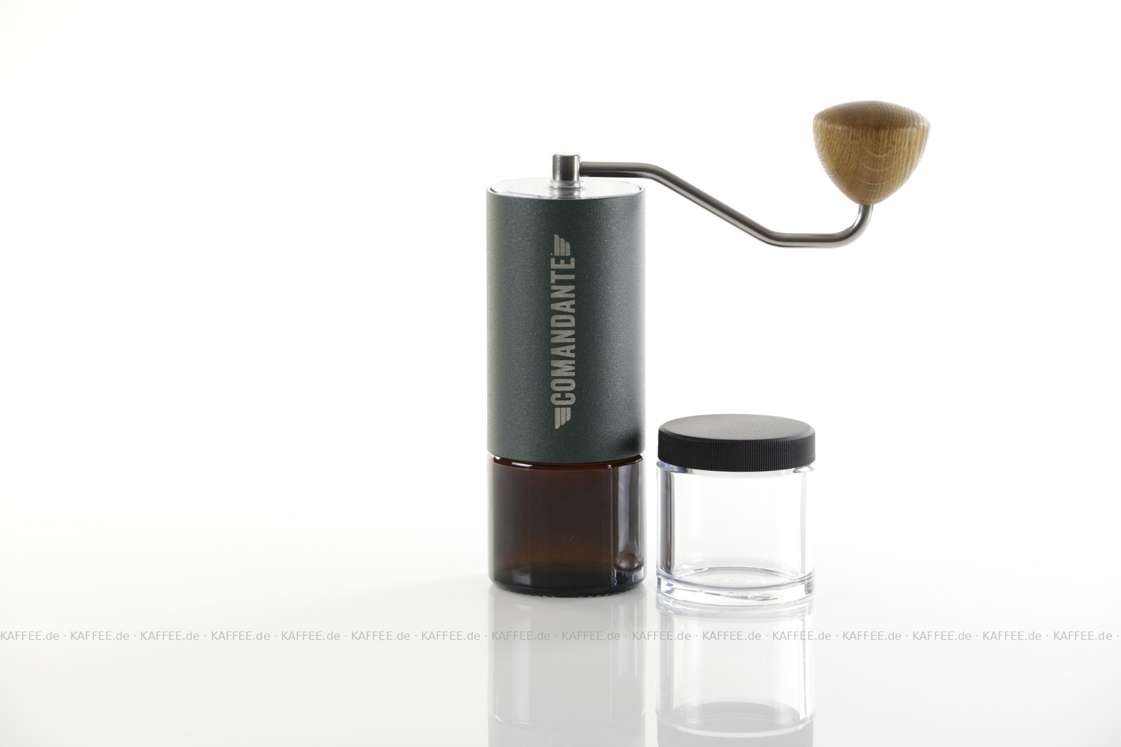 Design "Racing Green", sehr hochwertige Handmühle aus deutscher Produktion inkl. zwei Auffangbehälter Braunglas bzw. transparentem Polymer-Glas (Tritan), EAN-Code: 4260113438107