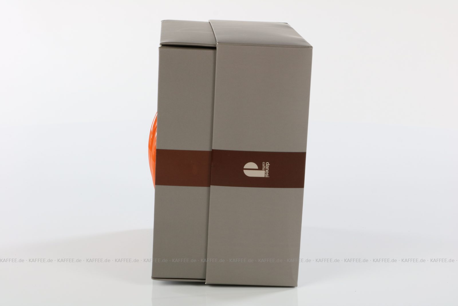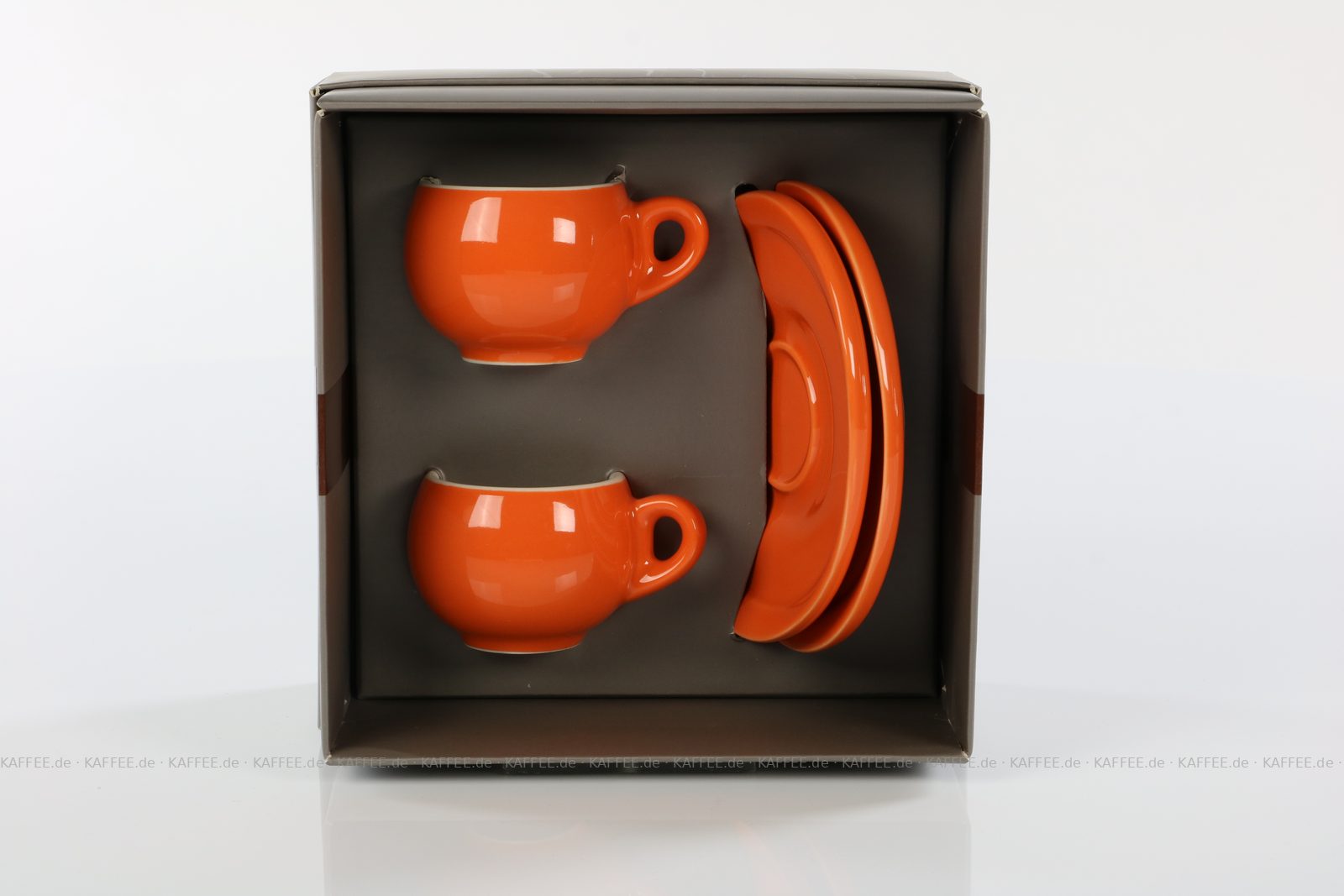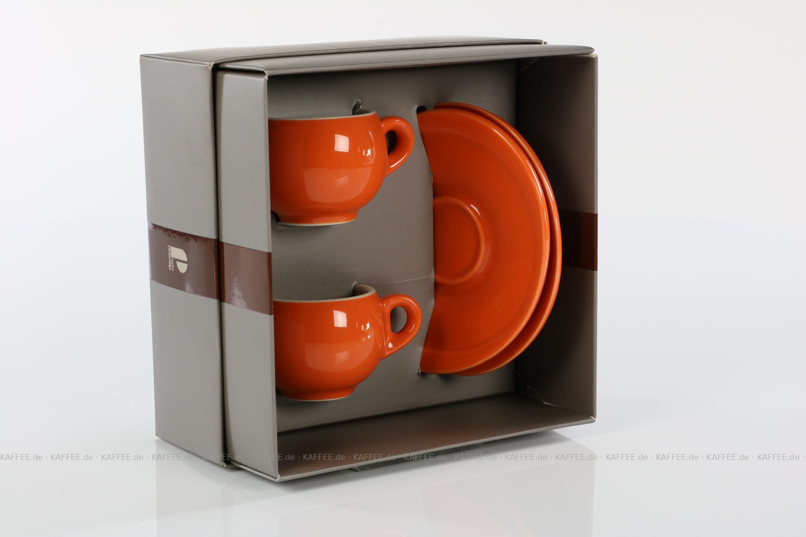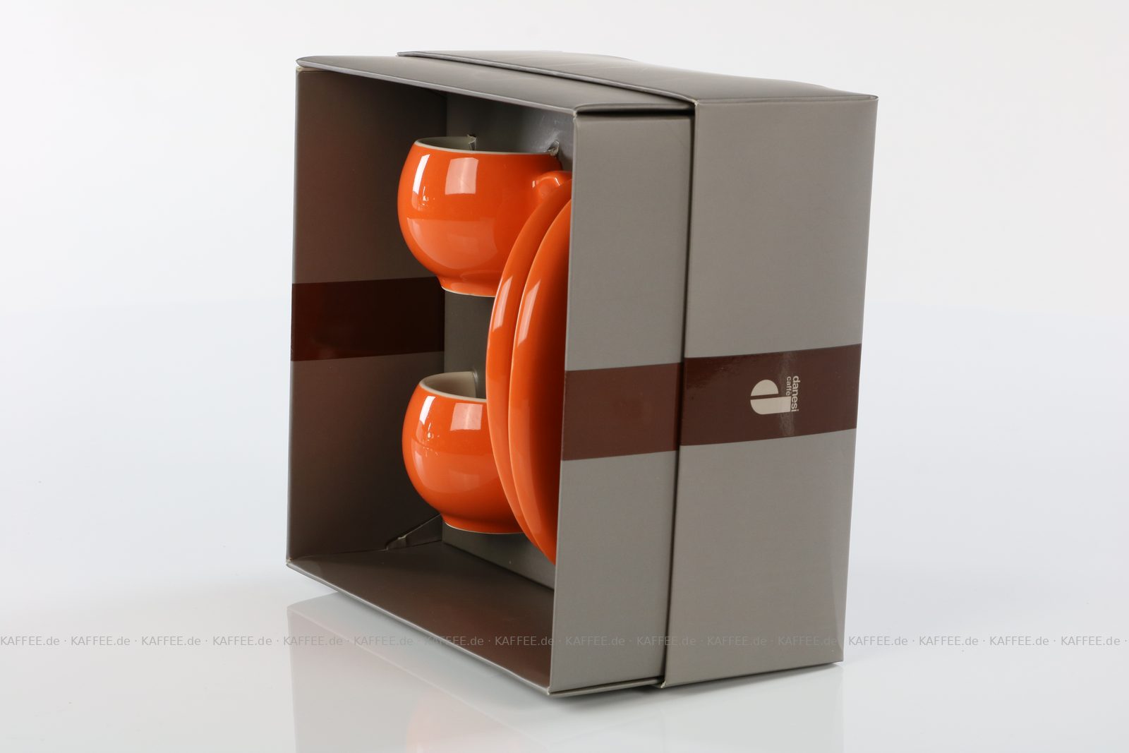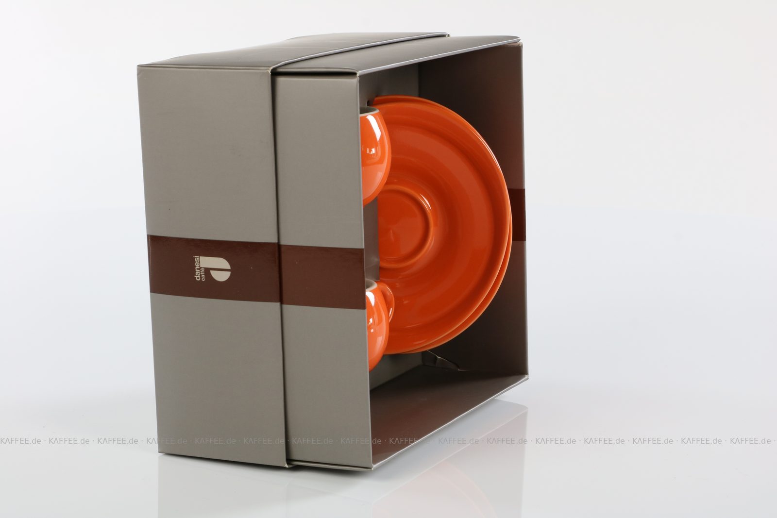 2 farbige (orange) DANESI Espressotassen mit Untertasse im Geschenkkarton, EAN-Code: 2709000011488 mehr