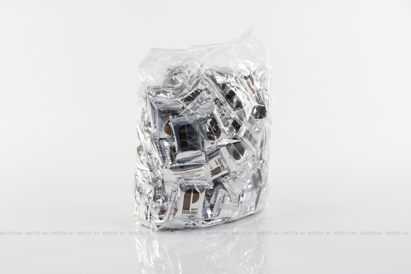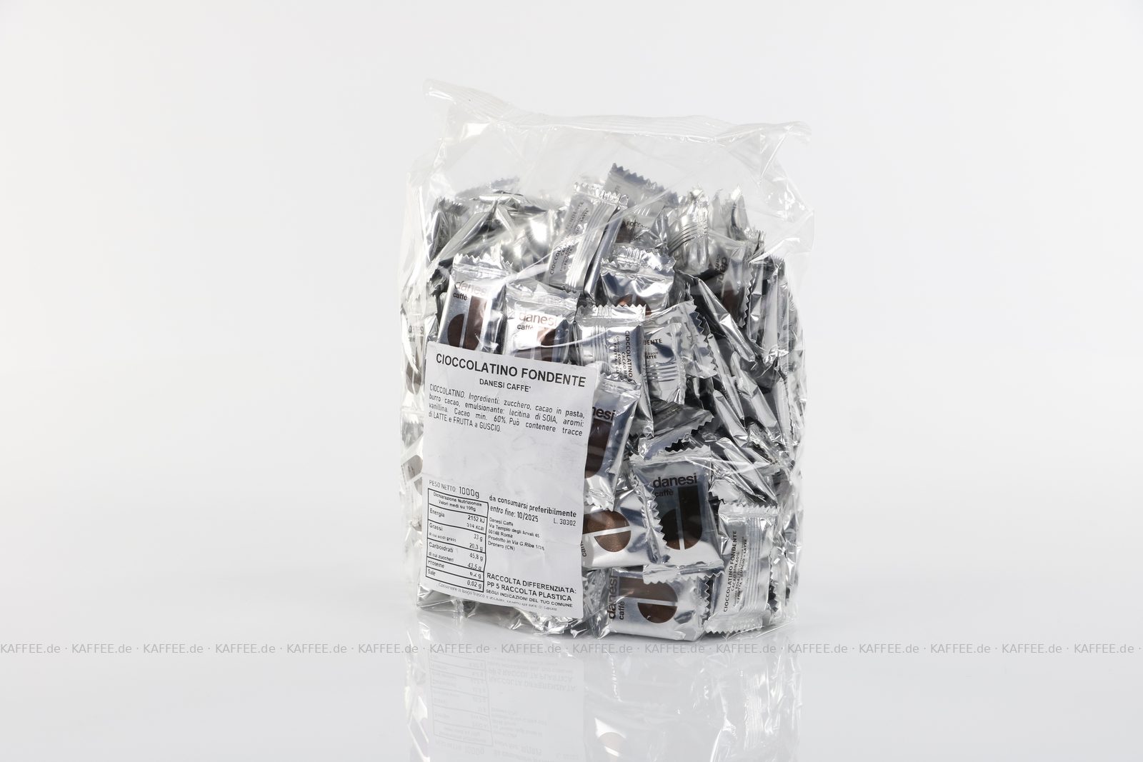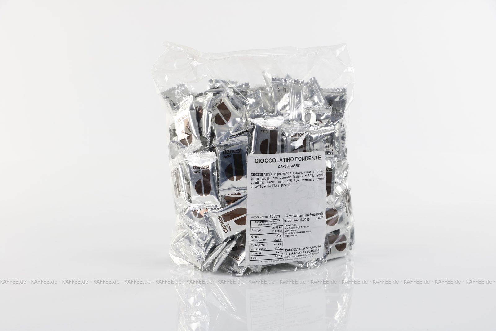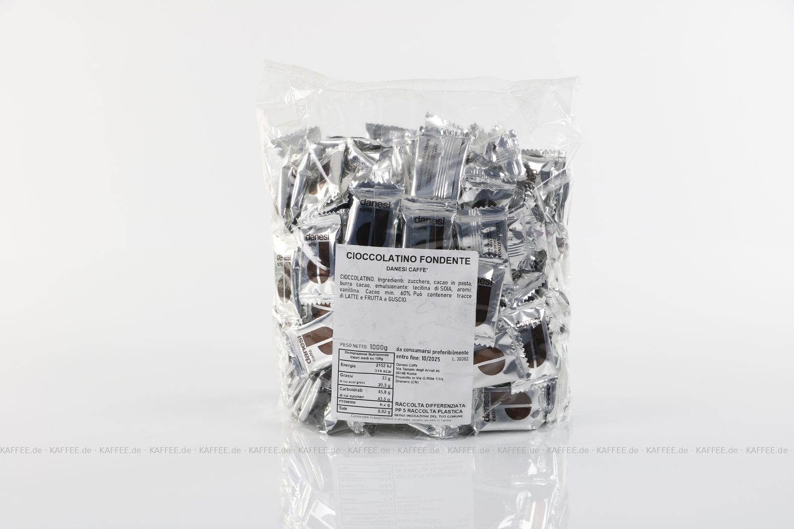 4 Bags je 1.000 g pro VPE, Gesamtinhalt 4,00 kg pro VPE Einzeln verpackte Täfelchen CIOCCOLATINO FONDENTE von DANESI mit mindestens 60% Kakaoanteil., EAN-Code: 2709000025980
