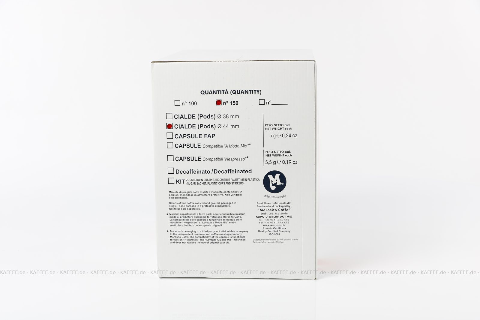 150 Pads je 7 g pro VPE, gemahlen, ESE-Standard 44 mm, Gesamtinhalt 1,05 kg pro VPE, EAN-Code: 8021014030038