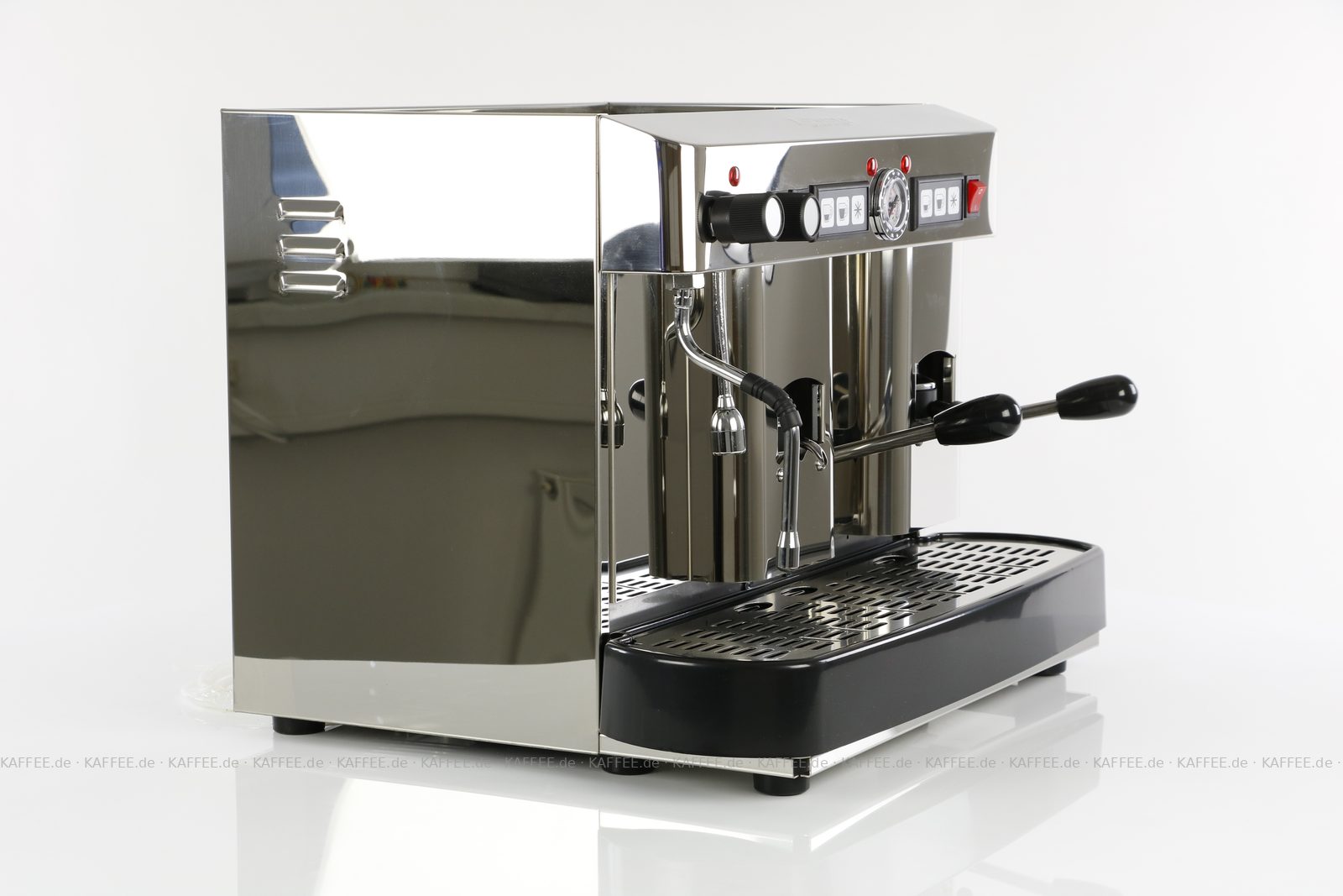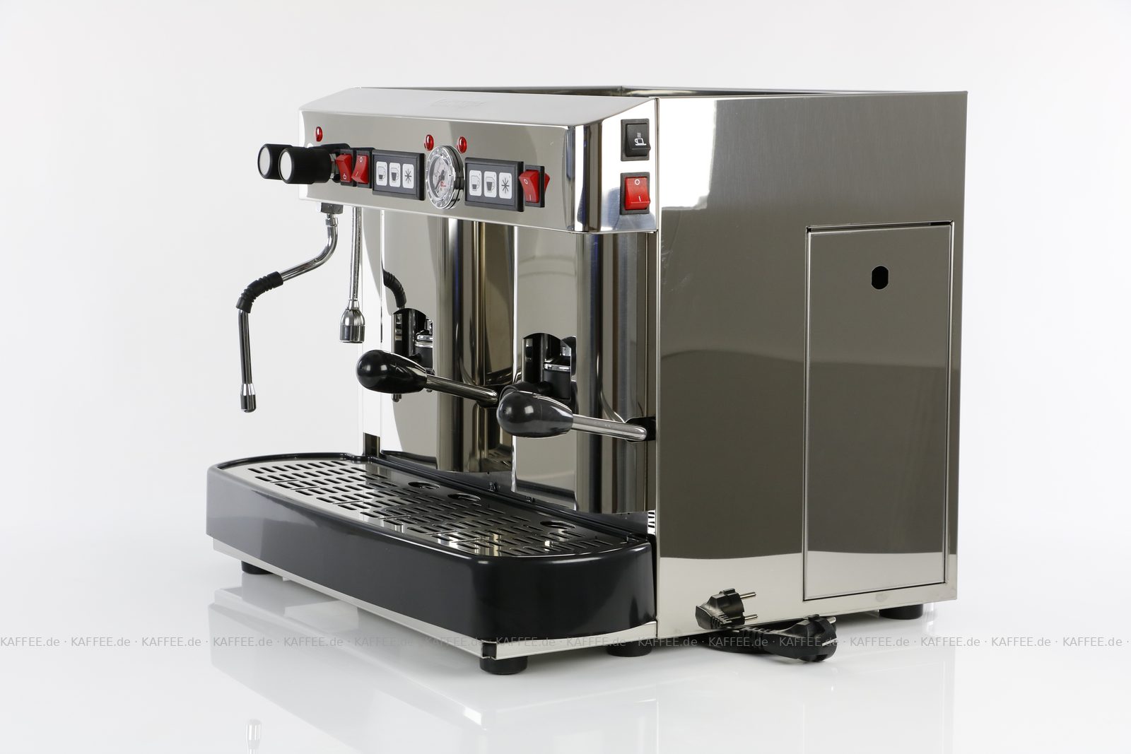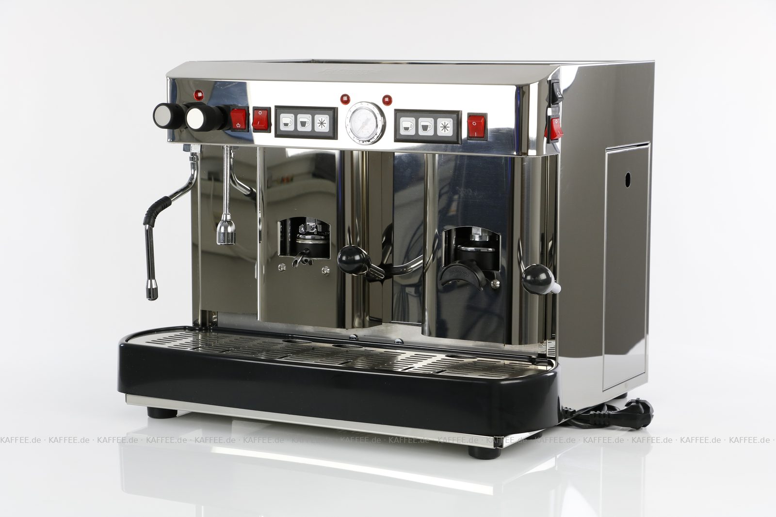 Espressomaschine für ESE-Pads (44 mm Standardpads) mit zwei Brühgruppen (7g/14g), automatische Dosierung, poliertem Edelstahl mit Seitenteilen ebenfalls in Edelstahl, Milchaufschäumer und Festwasseranschluß., EAN-Code: 2709000022231