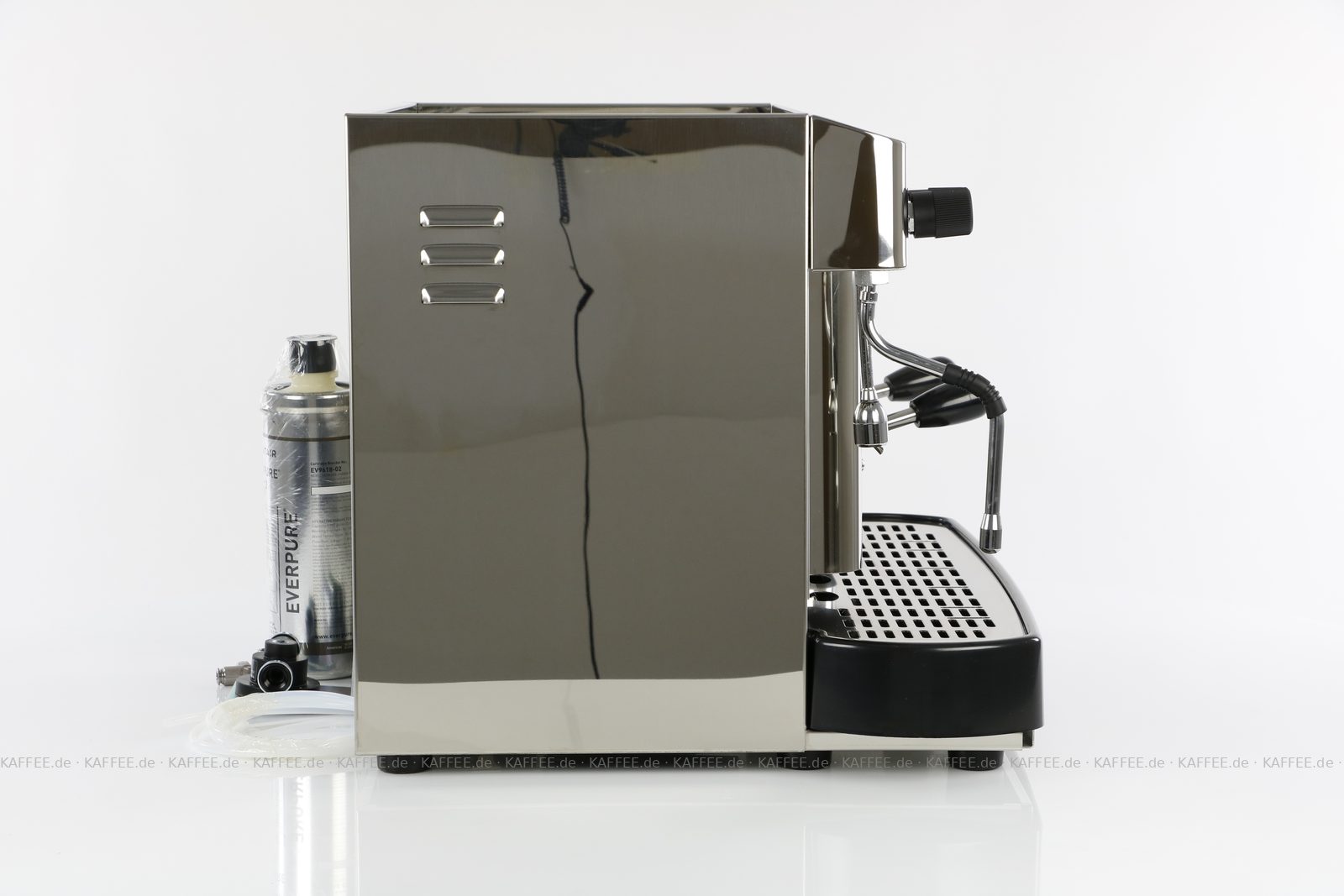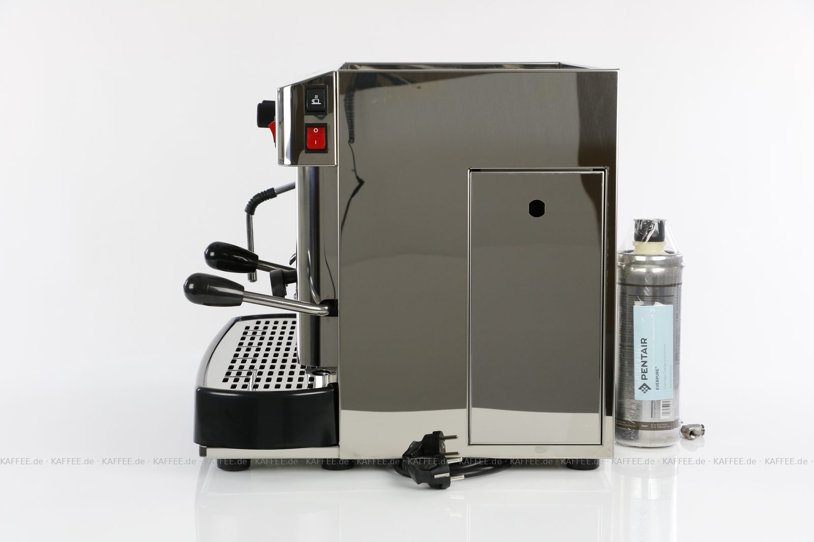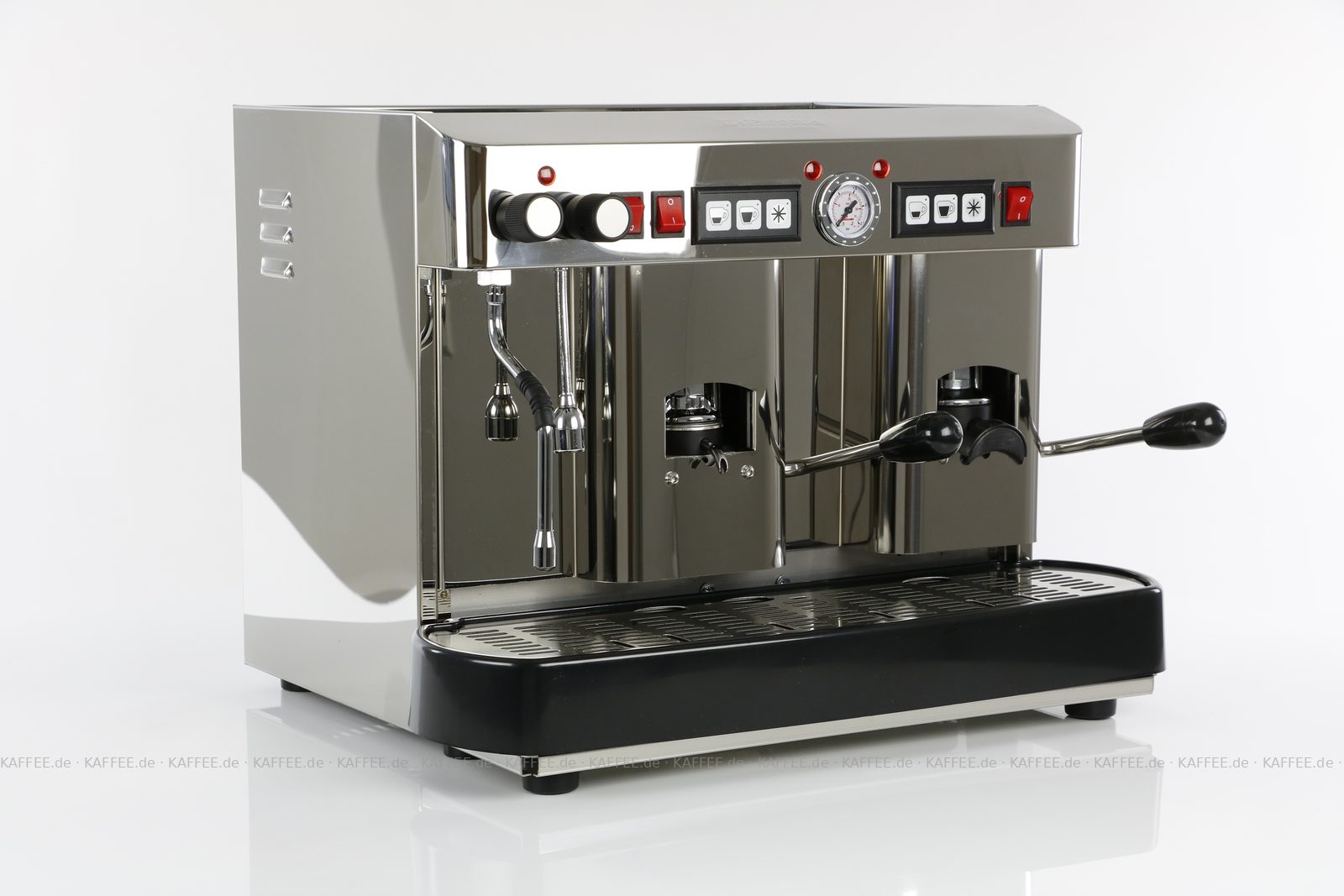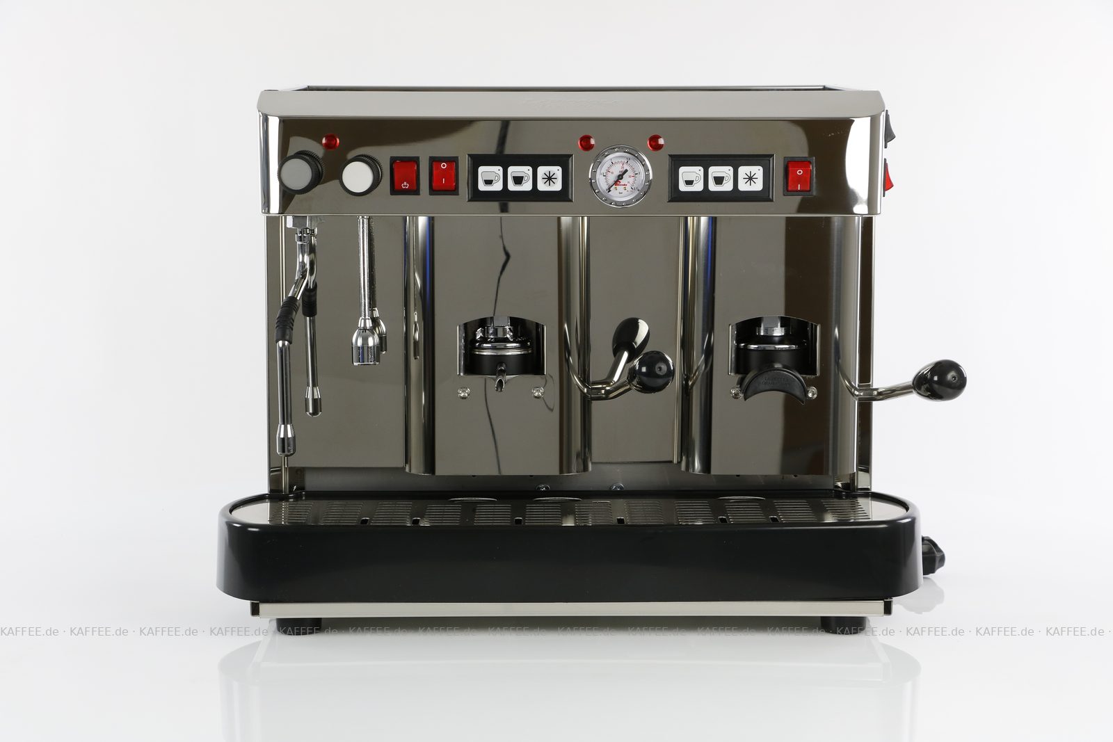 Espressomaschine für ESE-Pads (44 mm Standardpads) mit zwei Brühgruppen (7g/14g), automatische Dosierung, poliertem Edelstahl mit Seitenteilen ebenfalls in Edelstahl, Milchaufschäumer und Festwasseranschluß., EAN-Code: 2709000022231