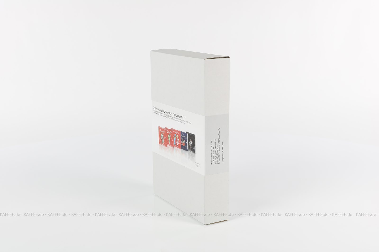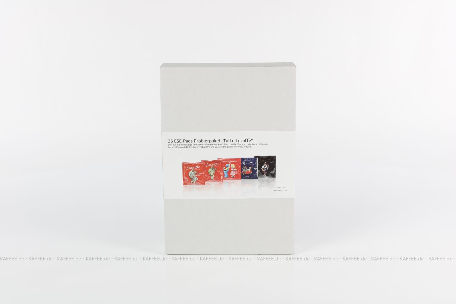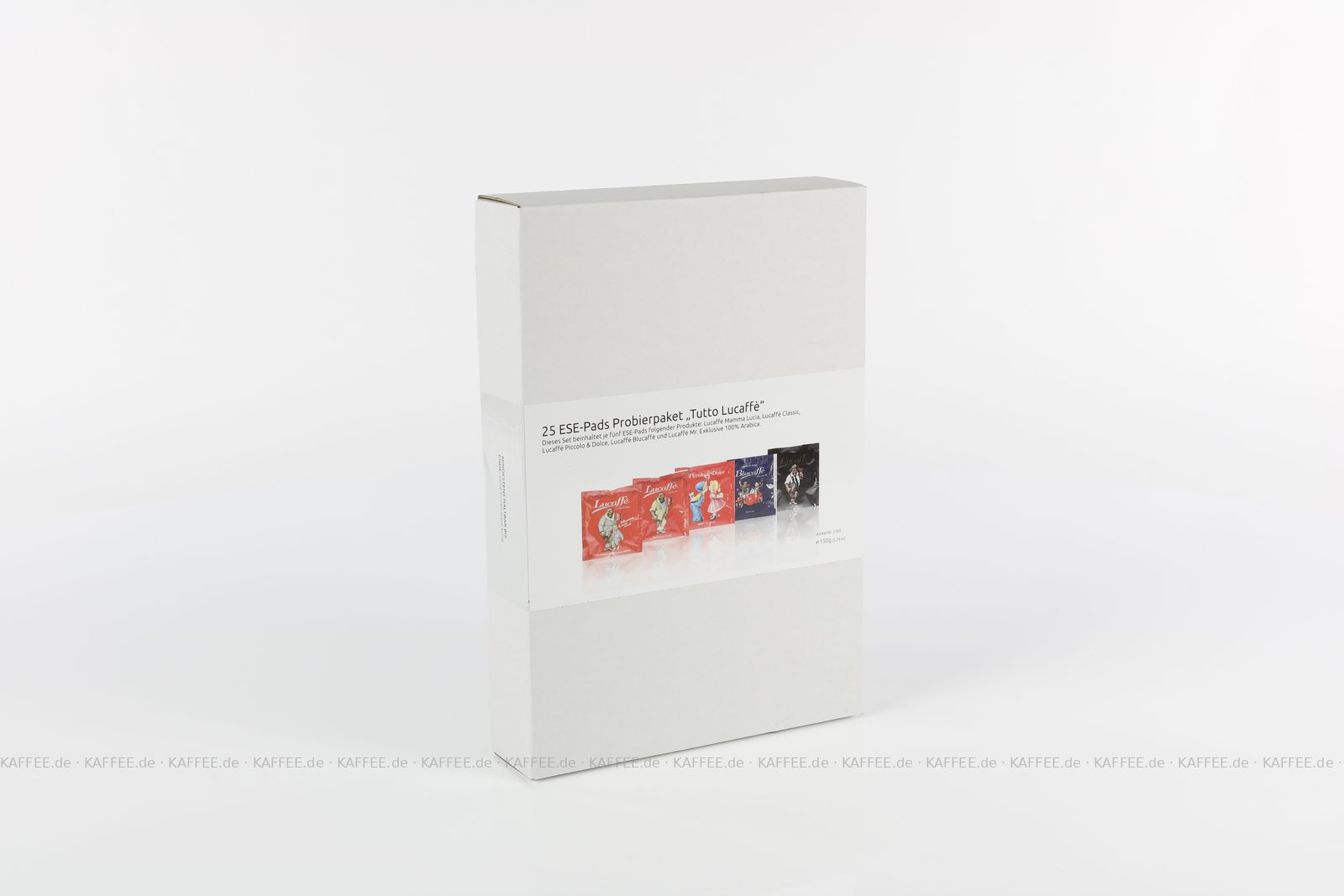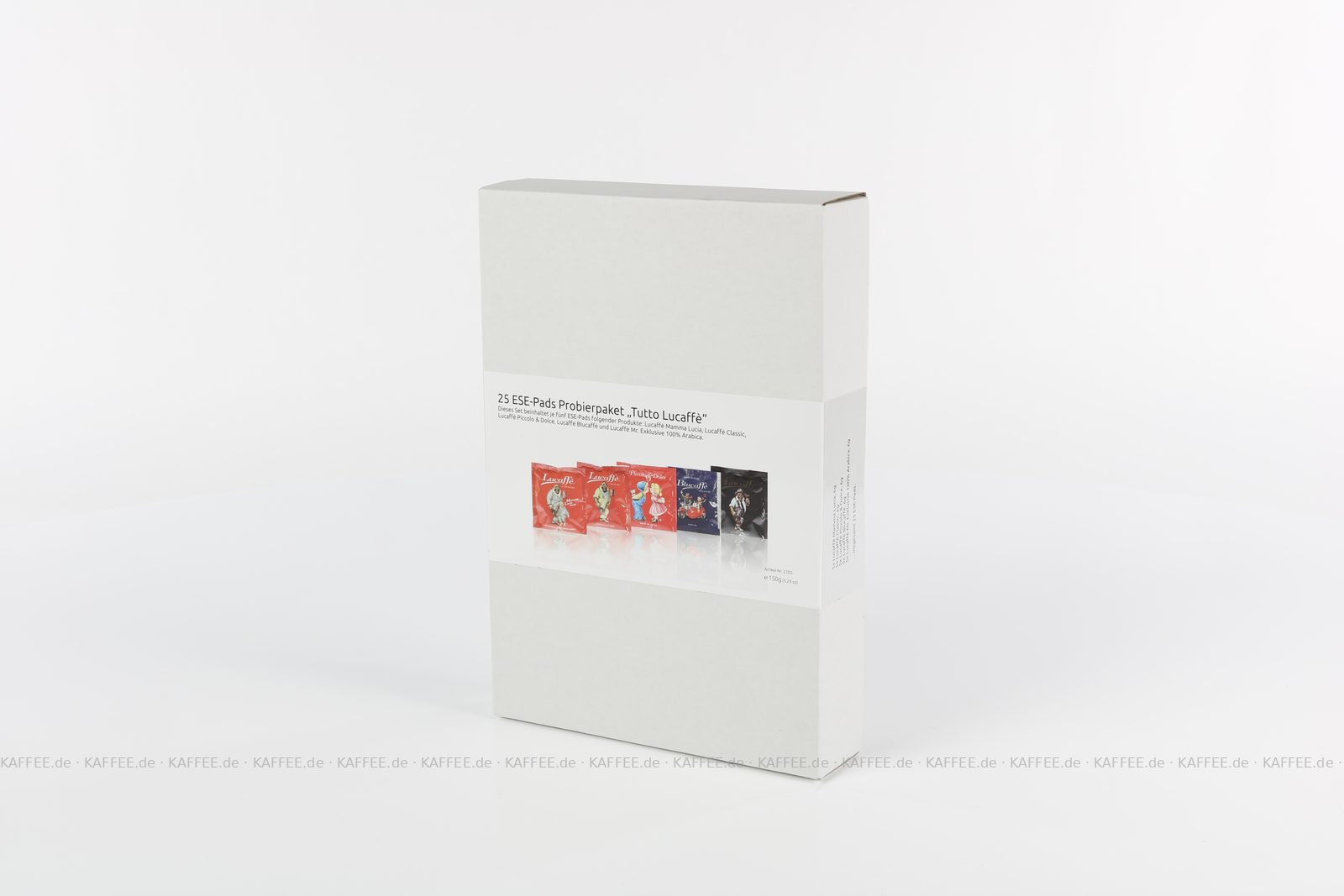 25 Pads je 6 g pro VPE, gemahlen, ESE-Standard 44 mm, Gesamtinhalt 150 g pro VPE Das Set beinhaltet je fünf ESE-Pads folgender Produkte: Lucaffé Mamma Lucia (1043), Lucaffé Classic (1042), Lucaffé Piccolo & Dolce (1157), Lucaffé Blucaffè (1156) und Lucaffé Mr. Exklusive 100% Arabica (1041)., EAN-Code: 4260404690795
